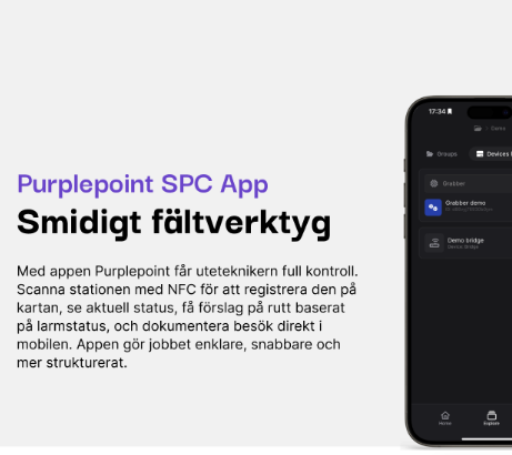 Med appen Purplepoint får uteteknikern full kontroll. Scanna stationen med NFC för att registrera den på kartan, se aktuell status, få förslag på rutt baserat på larmstatus, och dokumentera besök direkt i mobilen. Appen gör jobbet.